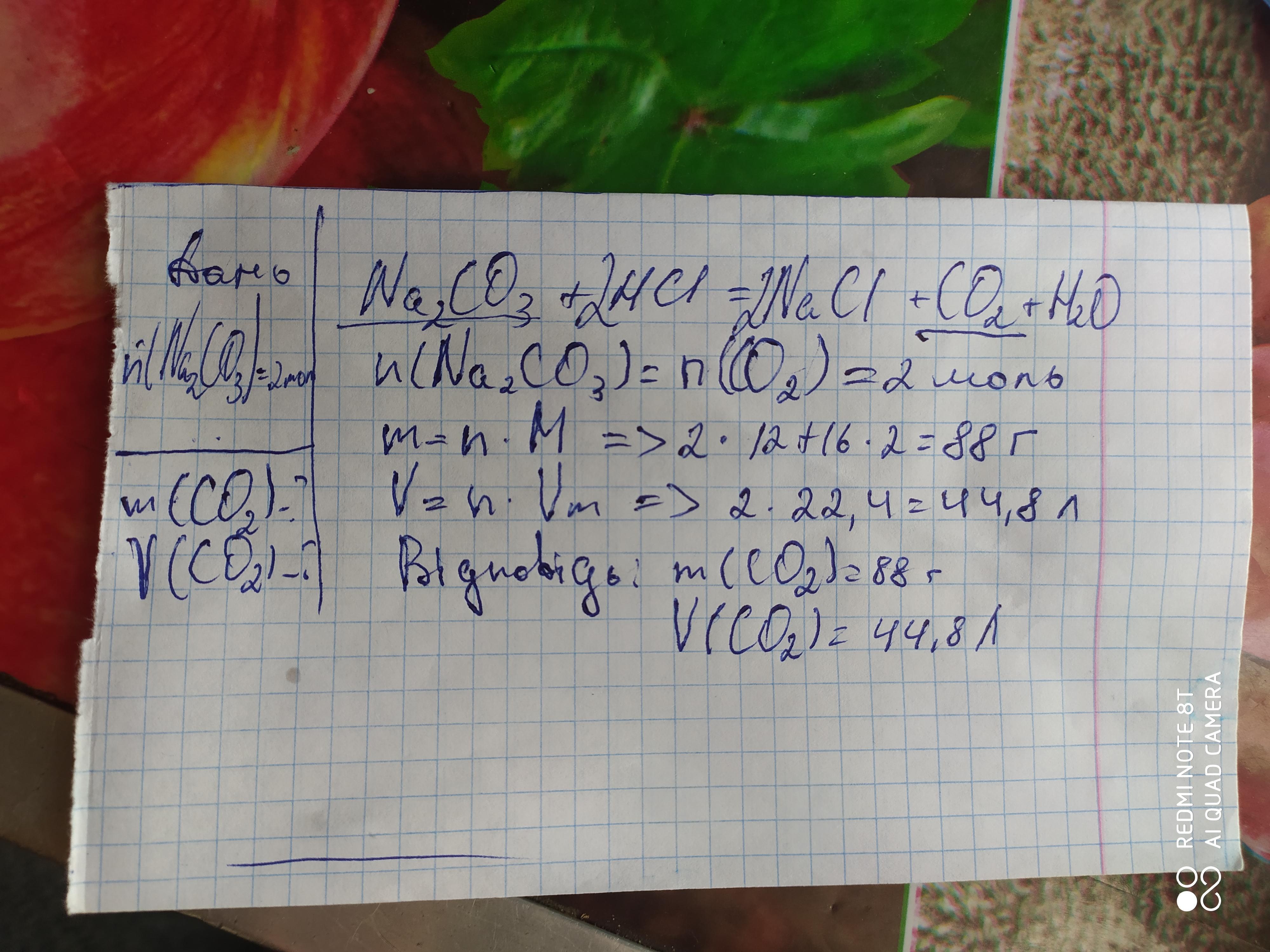 яку масу та об'єм вуглекислого газу можна добути під час взаємодії 2моль натрій карбонату з хлоридною кислотою