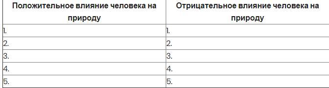 Положительное: создание заповедников, выращивание лесов, охрана редких растений и животных. Отрицательное: уничтожение редких растений и животных, вырубка лесов, загрязнение природы и атмосфера (например выхлопными газами)