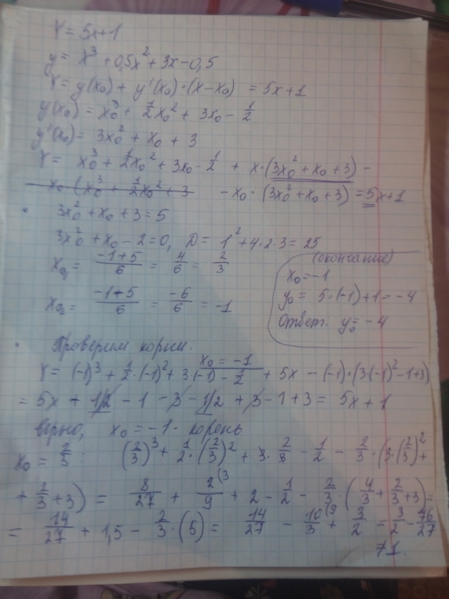прямая y=5x+1 является касательной к графику функции y=x^3+0.5x^2+3x-0.5 найдите ординату точки косания подробнее пожалуйста со штрихами