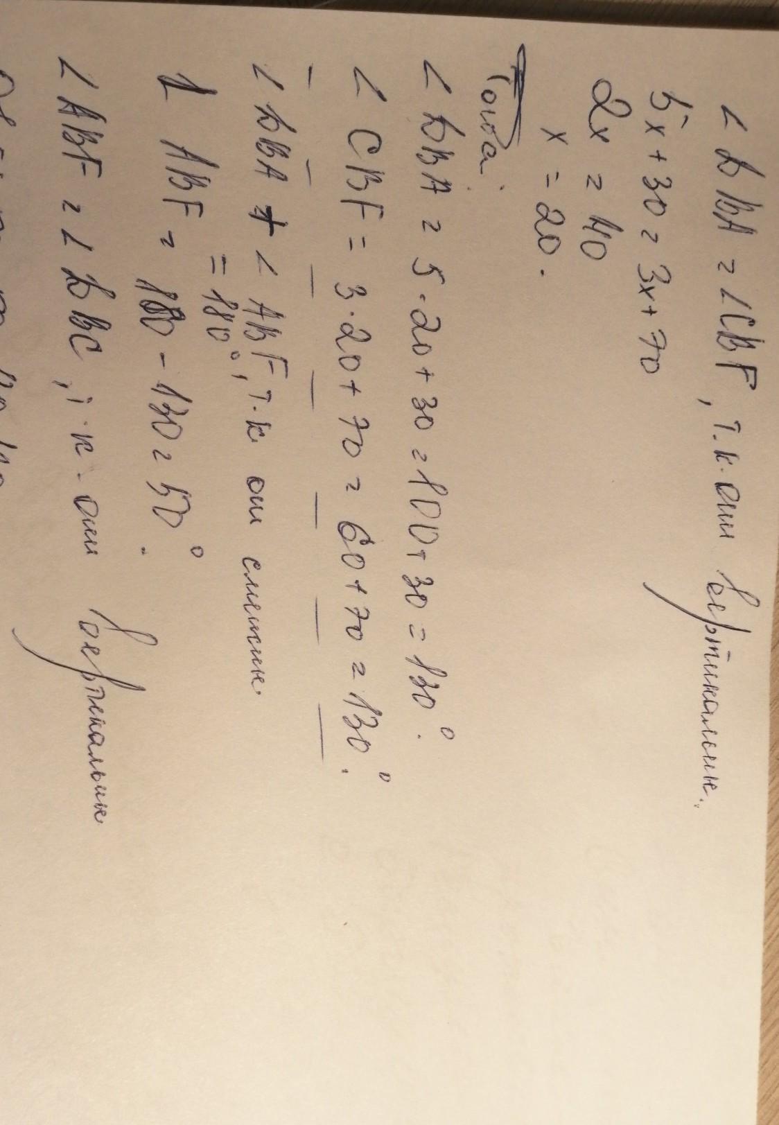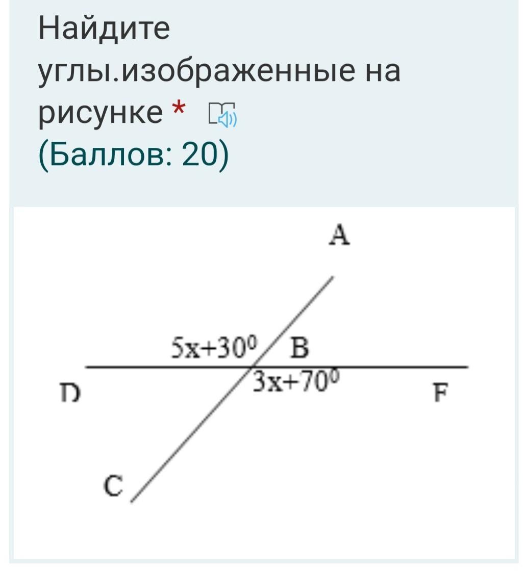 Так, как противоположные углы "креста" (Х) равны, то 5х + 30 = 3х + 70. Тогда 5х - 3х = 70 - 30. 2х = 40. х = 20.