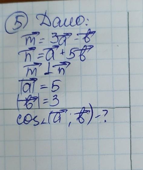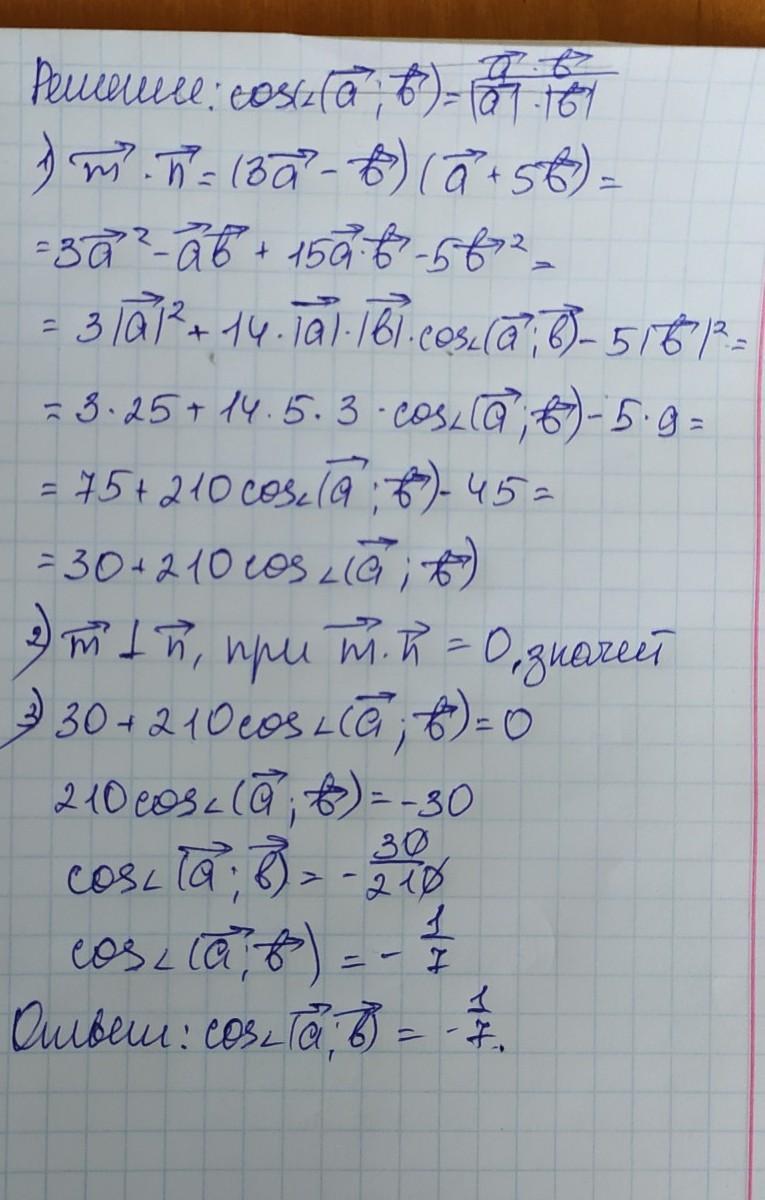 Найти косинус угла между векторами а и b, если вектора m=3a-b и n=a+5b перпендикулярны, а модуль а=5 и модуль b=3. Помогите срочно даю 50 баллов!!!!!!! С полным решением