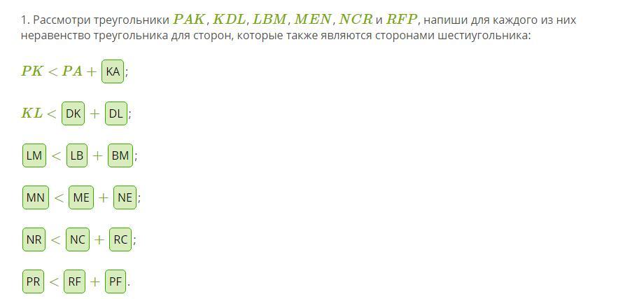 1. Рассмотри треугольники PAK, KDL, LBM, MEN, NCR и RFP, напиши для каждого из них неравенство треугольника для сторон, которые также являются сторонами шестиугольника:
