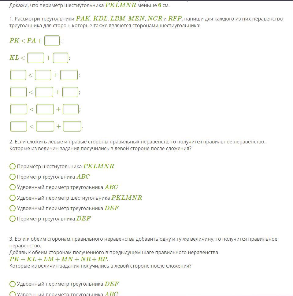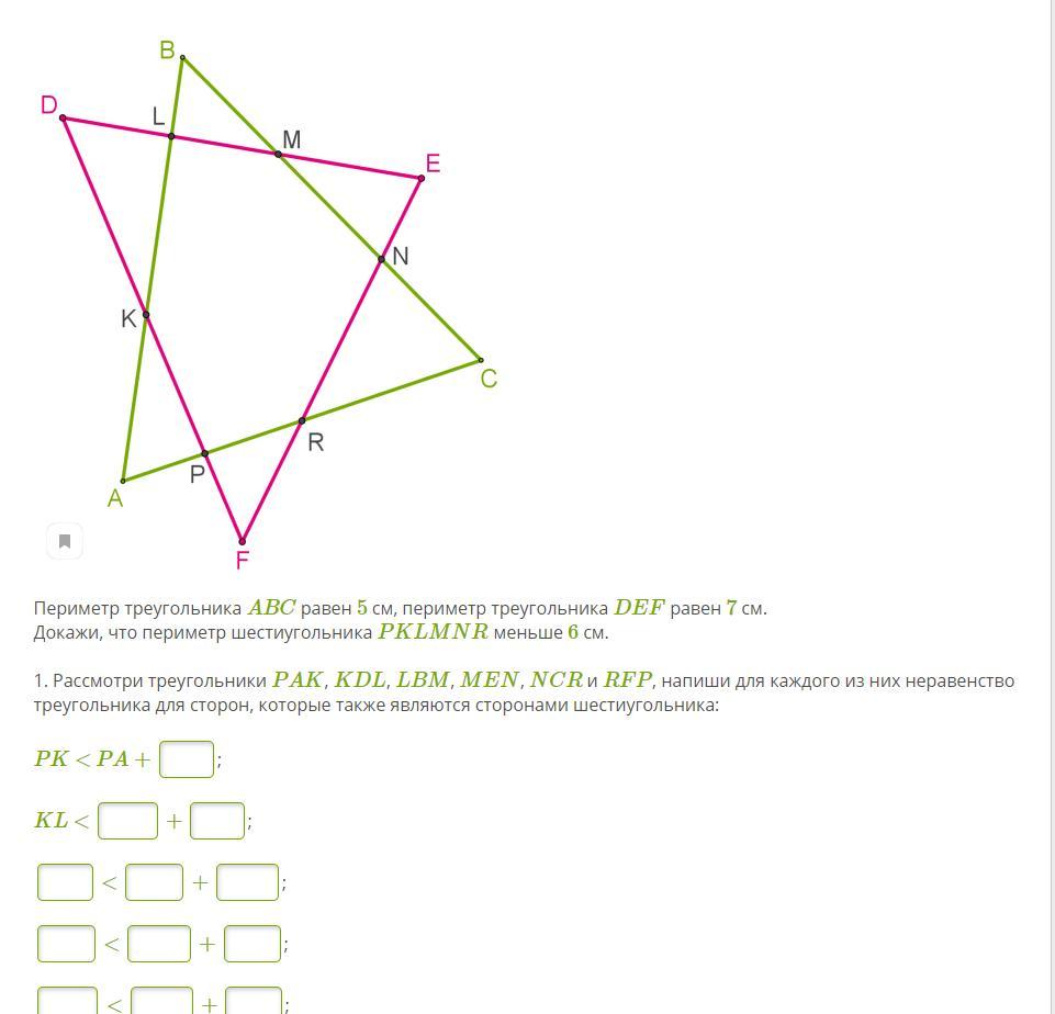 Докажи, что периметр шестиугольника PKLMNR меньше 6 см.