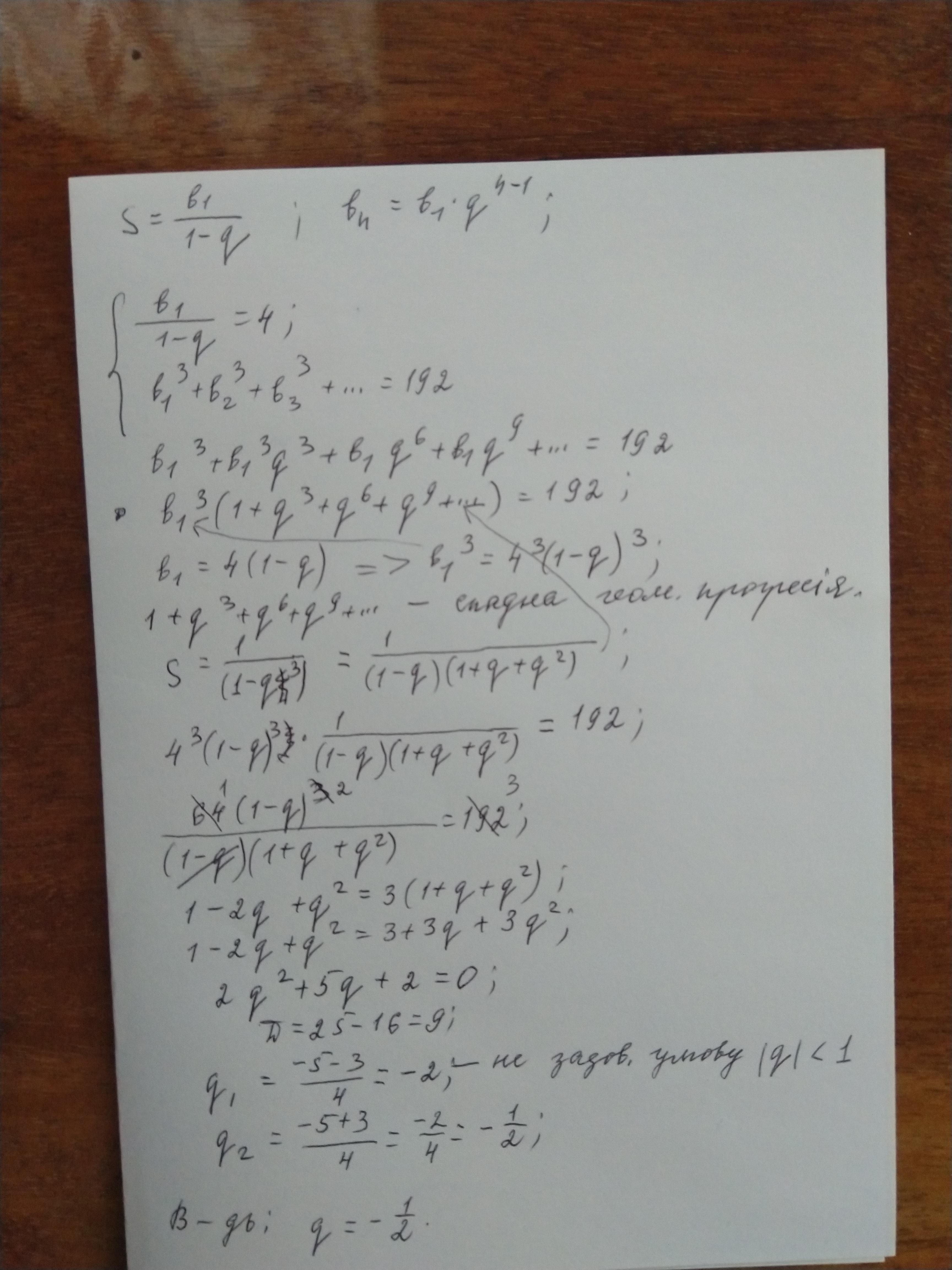 Сума нескінченної геометричної прогресії зі знаменником [q]<1 дорівнює 4, а сума кубів її членів дорівнює 192 знайти q