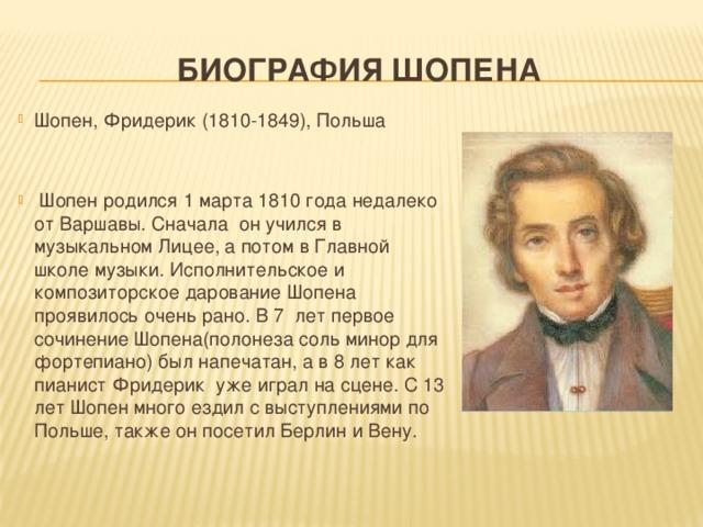 Шопен родился 1 марта 1810 года недалеко от Варшавы.Сначала он учился в музыкальном Лицее, а потом в Главной школе музыки.Исполнительское и композиторское дарование Шопена проявилось очень рано .В 7 лет первое сочинение Шопена (полонеза соль минор для фортепиано) был напечатан, а в 8 лет как пианист Фредерик уже играл на сцене.С 13 лет Шопен много ездил с выступлениями по Польше,также он посетил Берлин и Вену.