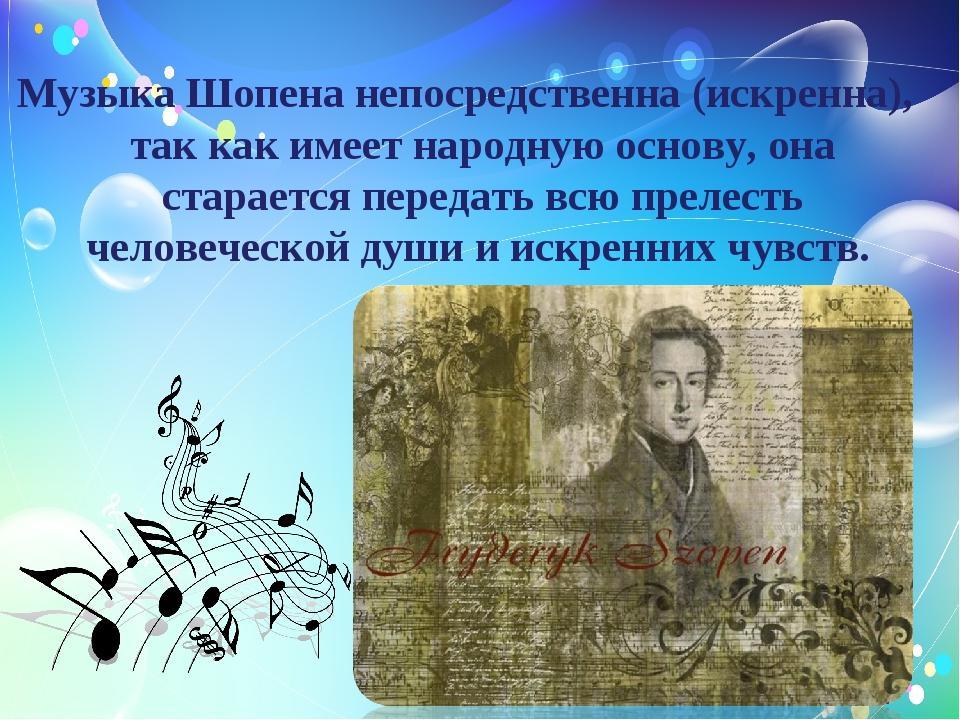 Музыка Шопена непосредственна (искренна) так как имеет народную основу,она старается передать всю прелесть человеческой души и искренних чувств.
