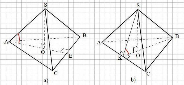 Угол между плоскостями SAC и АВС есть угол SKO между апофемой SK и высотой основания ВК как угол между двумя перпендикулярами, восставленными из точки К к линии пересечения АС плоскостей SAC и АВС
