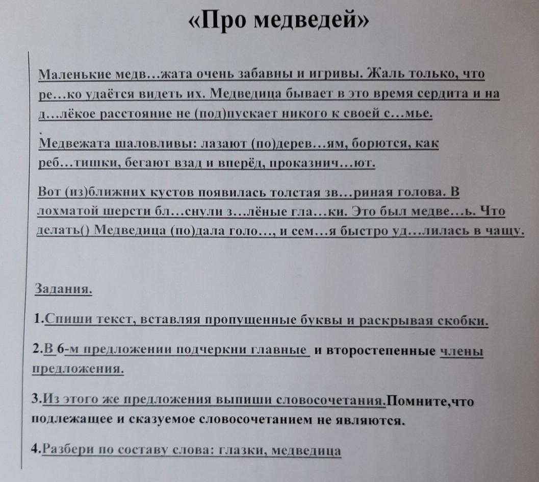 Медвежата,редко,далёкое,не подпускает,семье,по деревьям,ребятишки,проказничают,из ближних,звериная,блеснули,зелёные,глазки,медведь,подала,голос,семья,удалилась. В-предлог,лохматой-прилагательное(волнистой),шерсти-существительное(одной),блеснули-глагол(двумя),зелёные-прилагательное(волнистой),глазки-существительное(одной). Лохматой шерсти,зелёные глазки. Состав слова «медведица»: корень [медвед] + суффикс [иц] + окончание [а]