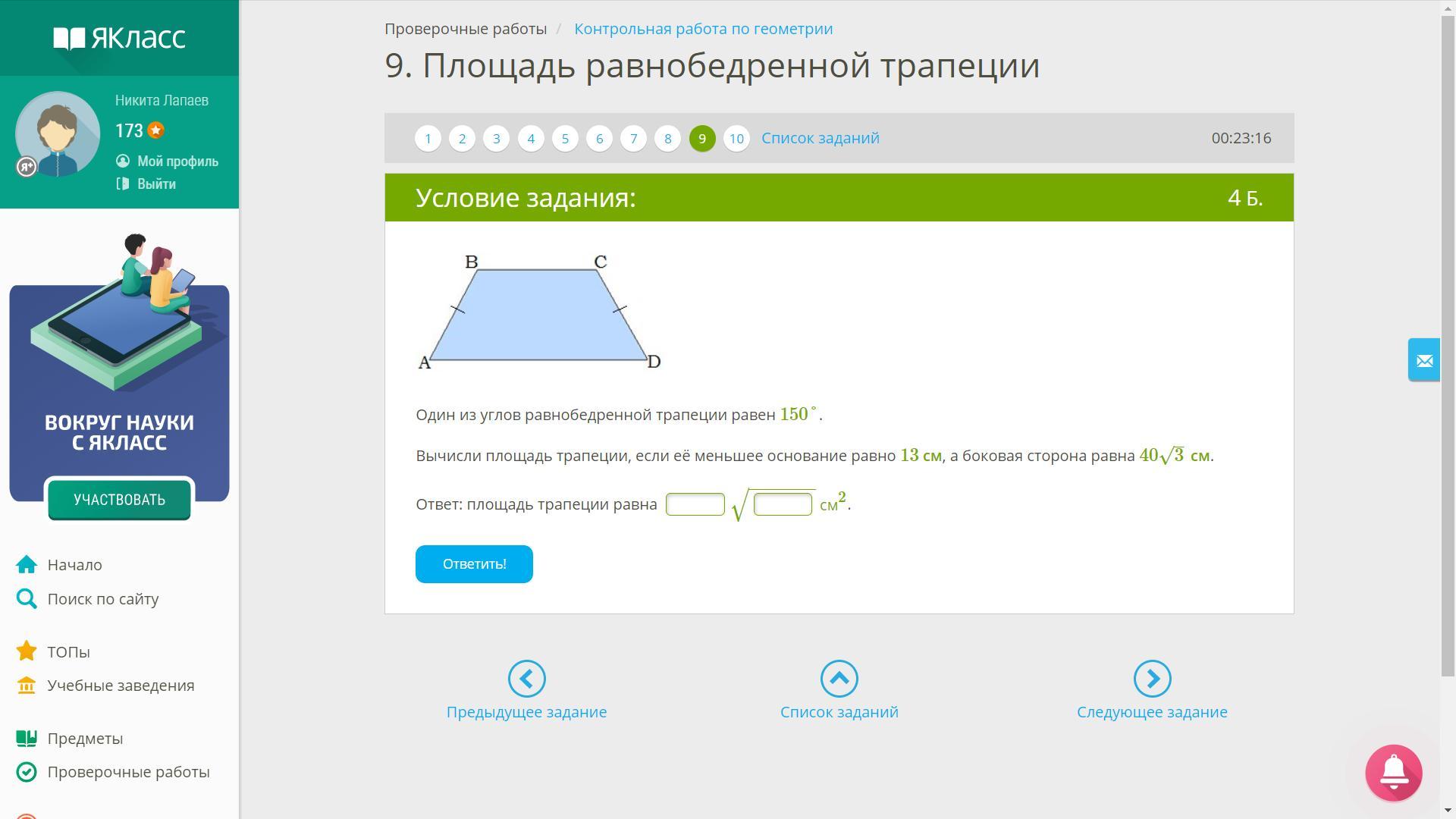 Один из углов равнобедренной трапеции равен 150°. Вычисли площадь трапеции, если её меньшее основание равно 13 см , а боковая сторона равна 40√3 см. --------------