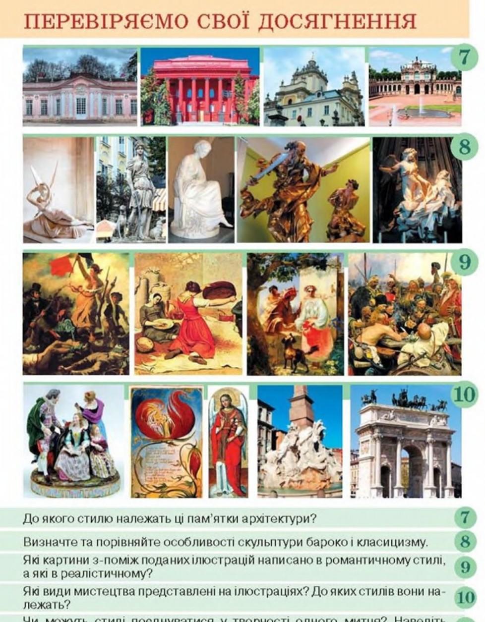 10 перша ілюстрація - це скульптура (вид скульптури: скульптура маленьких форм), відноситься до стилю рококо; друга - живопис або графіка (я не пам'ятаю, більше підходить живопис), стиль романтизм; третя - живопис, виконаний в стилі бароко; четверта - фонтан, який відноситься до скульптури, виконаний в жанрі бароко; п'ята - архітектура нового часу: класицизм