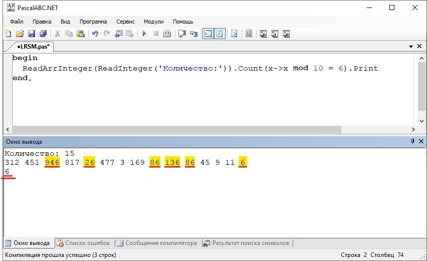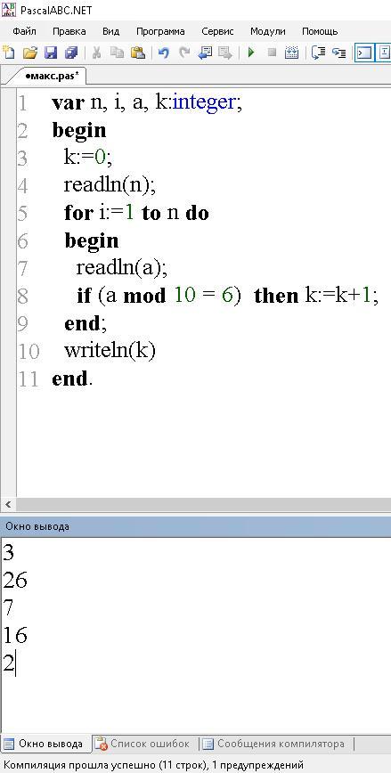 Напишите программу в Паскале, которая в последовательности натуральных чисел определяет количество чисел, оканчивающихся на 6. Программа получает на вход количество чисел в последовательности, а затем сами числа. В последова-тельности всегда имеется число, оканчивающееся на 6. Количество чисел не превышает 1000. Введённые числа не превышают 30 000. Программа должна вывести одно число – количество чисел, оканчивающихся на 6,нужна работающая программа и фото работы программы
