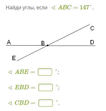 Угол ЕВД=углу АВС=147* так как вертикальные, а вертикальные углы равны. Угол СВД=180*-147*=33* так как они смежные, а сумма смежных углов равна 180*. Угол АВЕ=углу СВД=33* так как вертикальные, а вертикальные углы равны.
