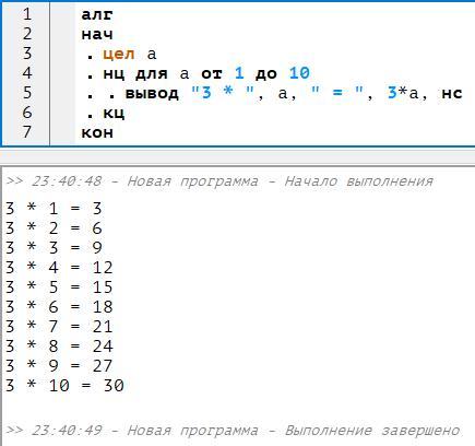 вывод "3 * ",счетчик," = ", 3*счетчик, нс