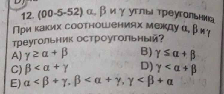 На сайте произошел какой-то сбой, в результате чего потерялось решение. Восстанавливать с самого начала нет сил, поэтому напишу коротко: A, B, C и D не могут гарантировать остроугольность, а пункт E) гарантирует его. В самом деле, если