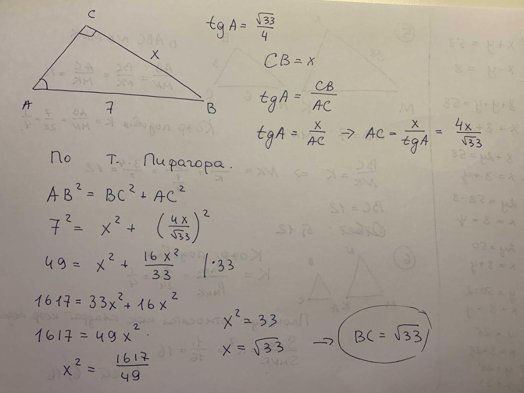 помогите пожалуйста очень прошу. P.s. Надо найти длину стороны BC, а tg(A)=корень33/4