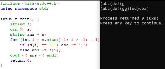 Дана строка, содержащая только английские буквы (большие и маленькие) и открывающиеся скобки. Сформировать новую строку добавлением справа «зеркальной» строки с закрывающимися скобками. "(abc(def(g" -> "(abc(def(gg)fed)cba)"