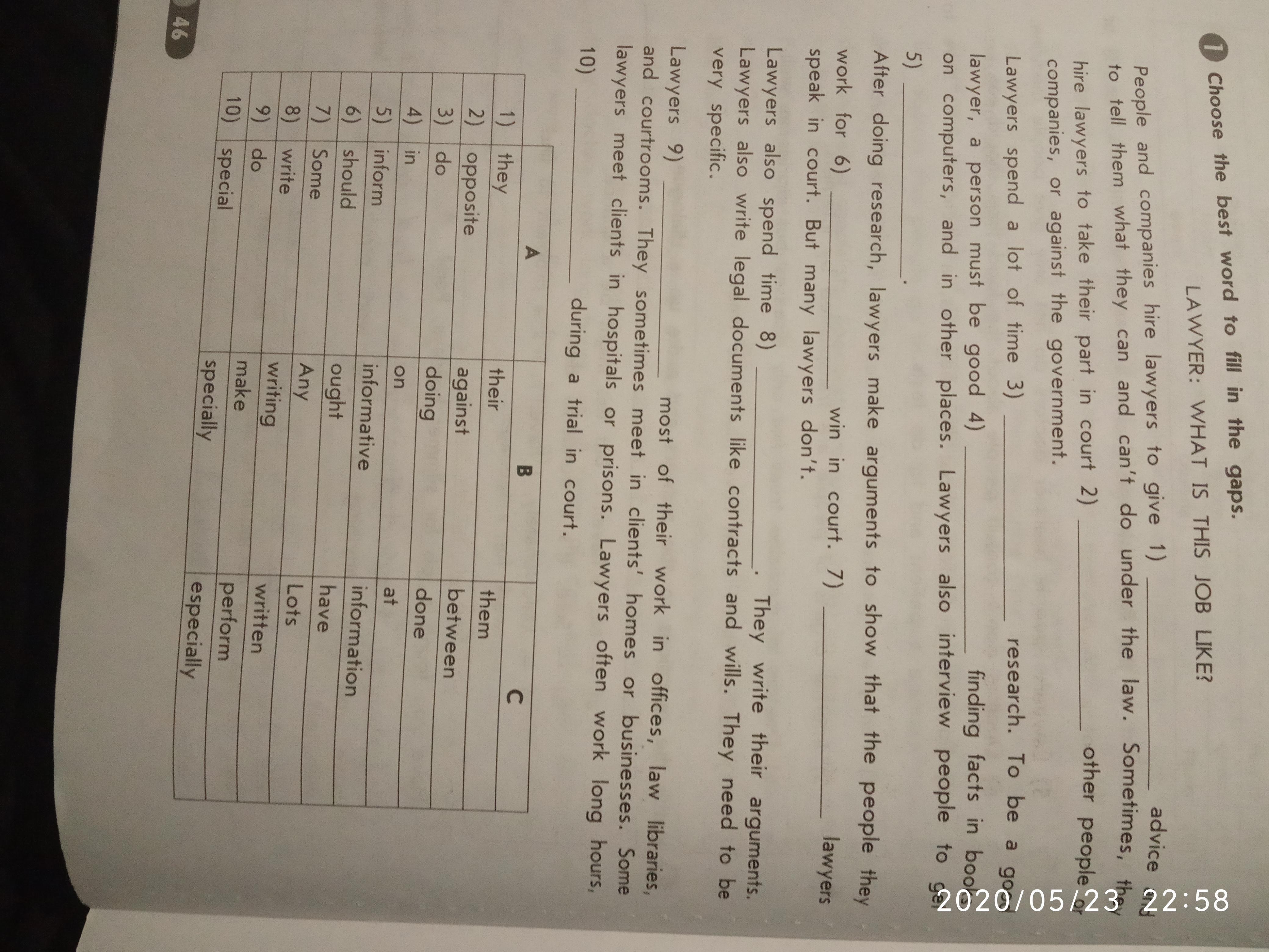 Lawyers also spend time writing. They write their arguments. Lawyers also write legal documents like contracts and wills. They need to be very specific.