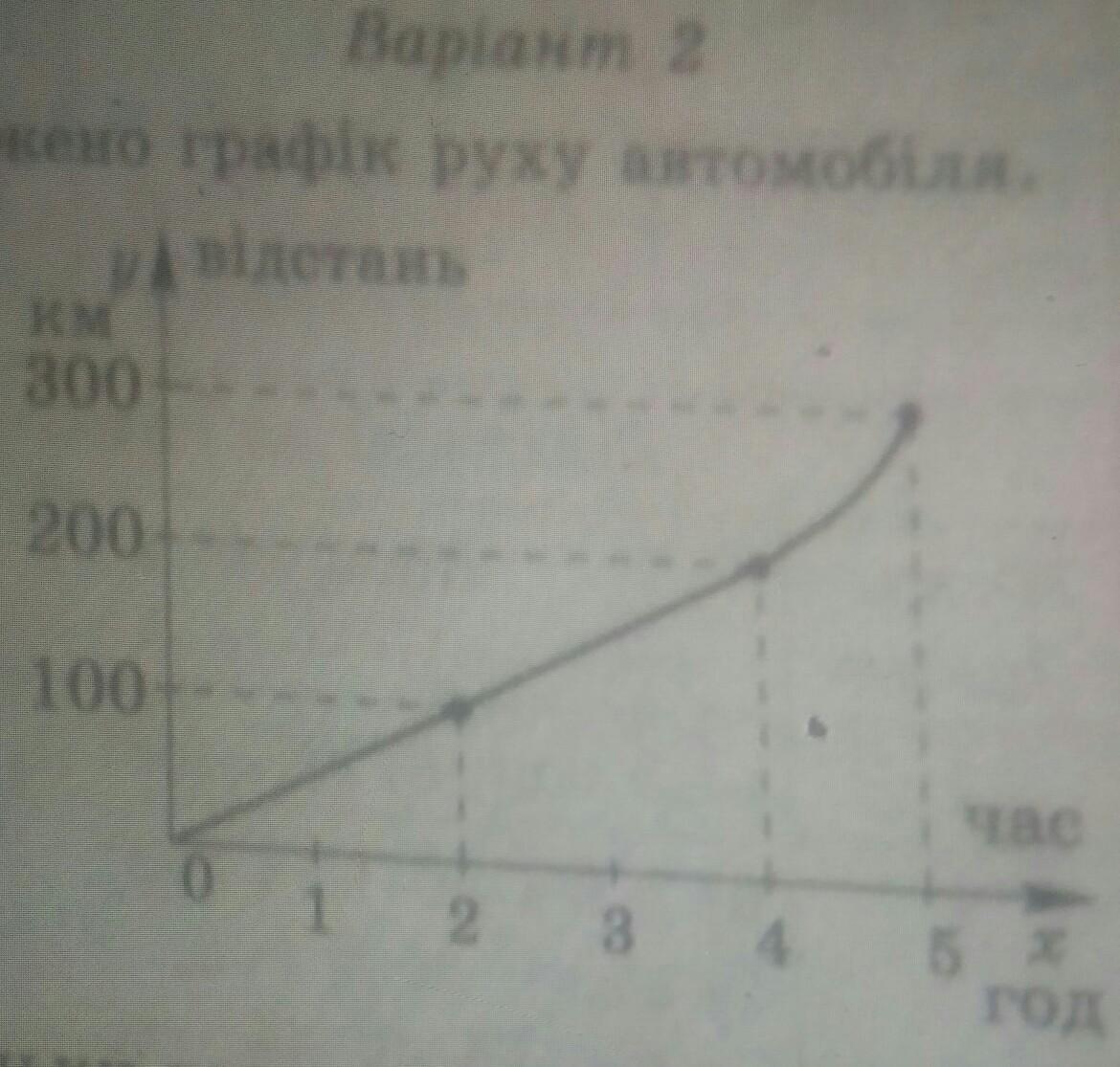 на малюнку зображено графік руху автомобіля.За графіком з'ясуйте:а) скільки годин автомобіль був у дорозі ;б) скільки км він проїхав за перші чотири години; в) чи змінилась швидкість його руху.
