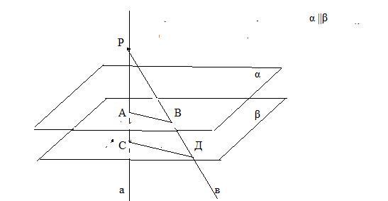 1.Точка Р не лежит между параллельными плоскостями и . Через точку Р проведены прямые а и в, пересекающие плоскость в точках А и В, а плоскость в точках С и Д соответственно. Найти длину отрезка АВ, если СД=10,5см, РА: АС=2:5.