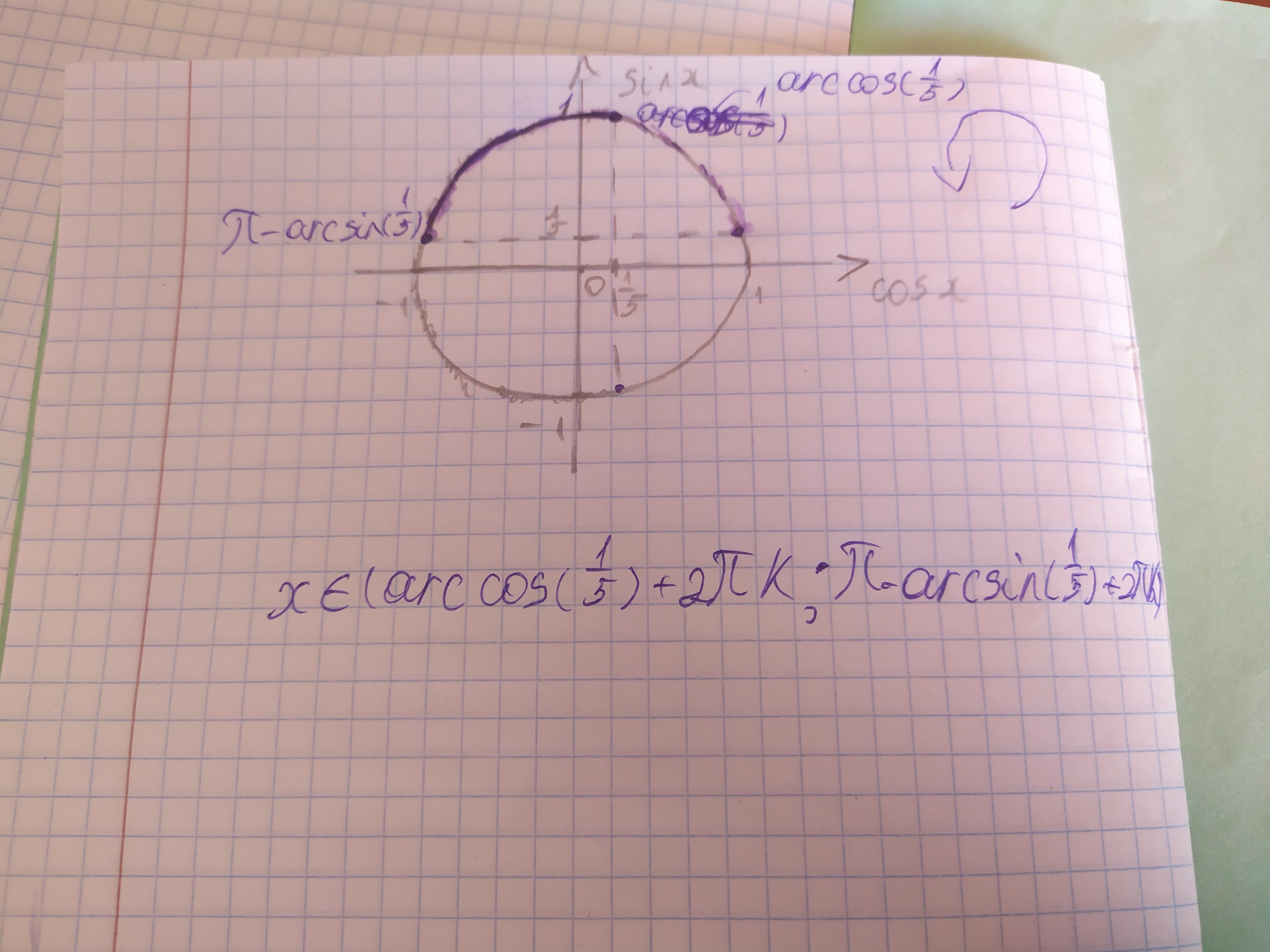 Я отметил на триганометре решения каждого неравенства по отдельности, а решением является подчеркнутым ручкой пересечение(соответствующте точки расставил)