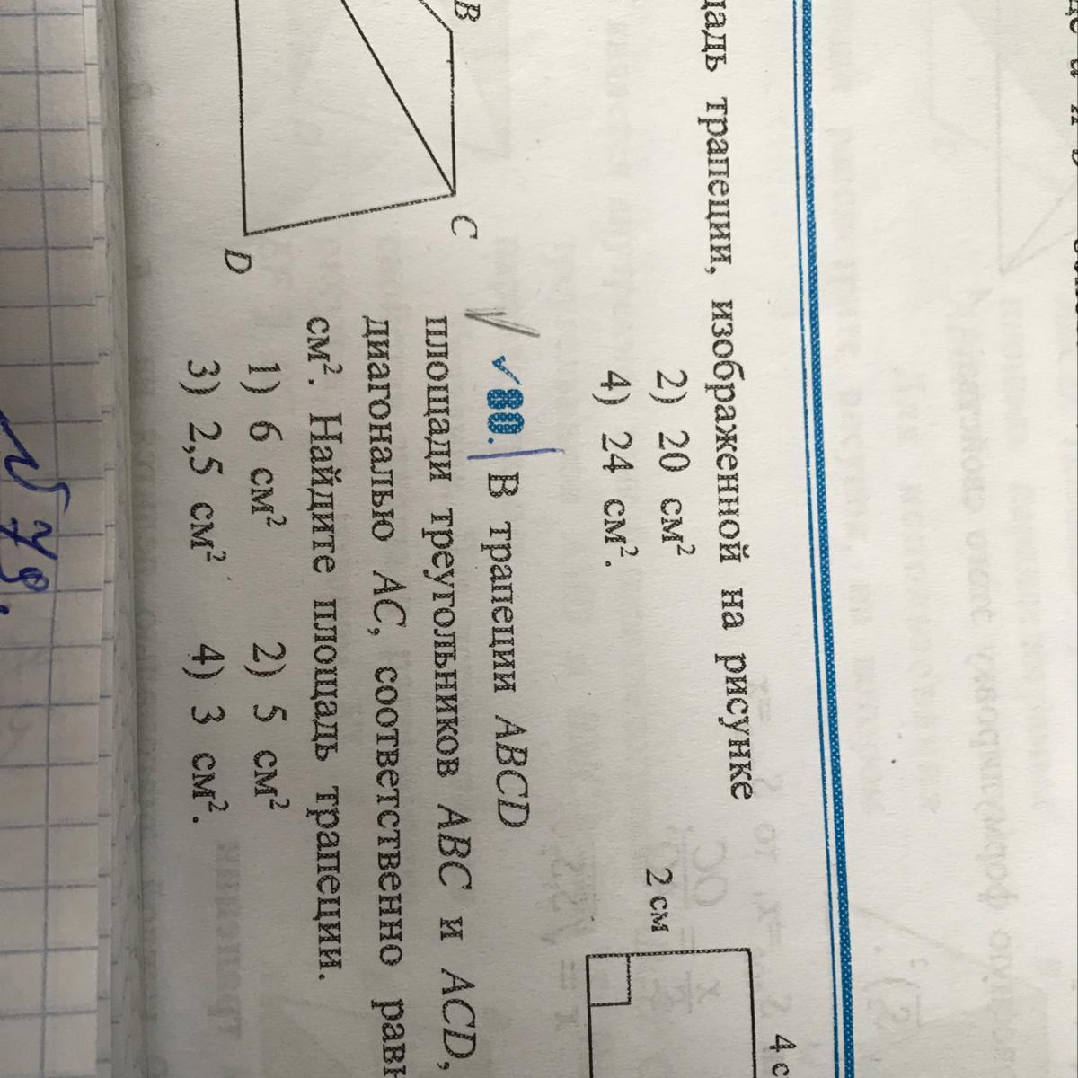 площадь трапеции состоит из площадей треугольников АВС и АСД ,2см2+3см2=5 см2