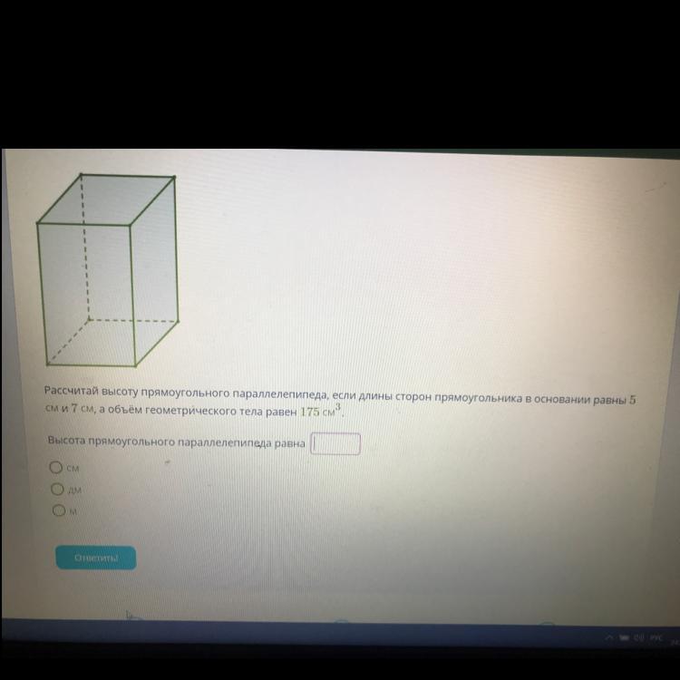 175:7:5=7 см (см т.к. см в кубе делишь на см и ещё раз на см, поэтому см обычные)