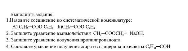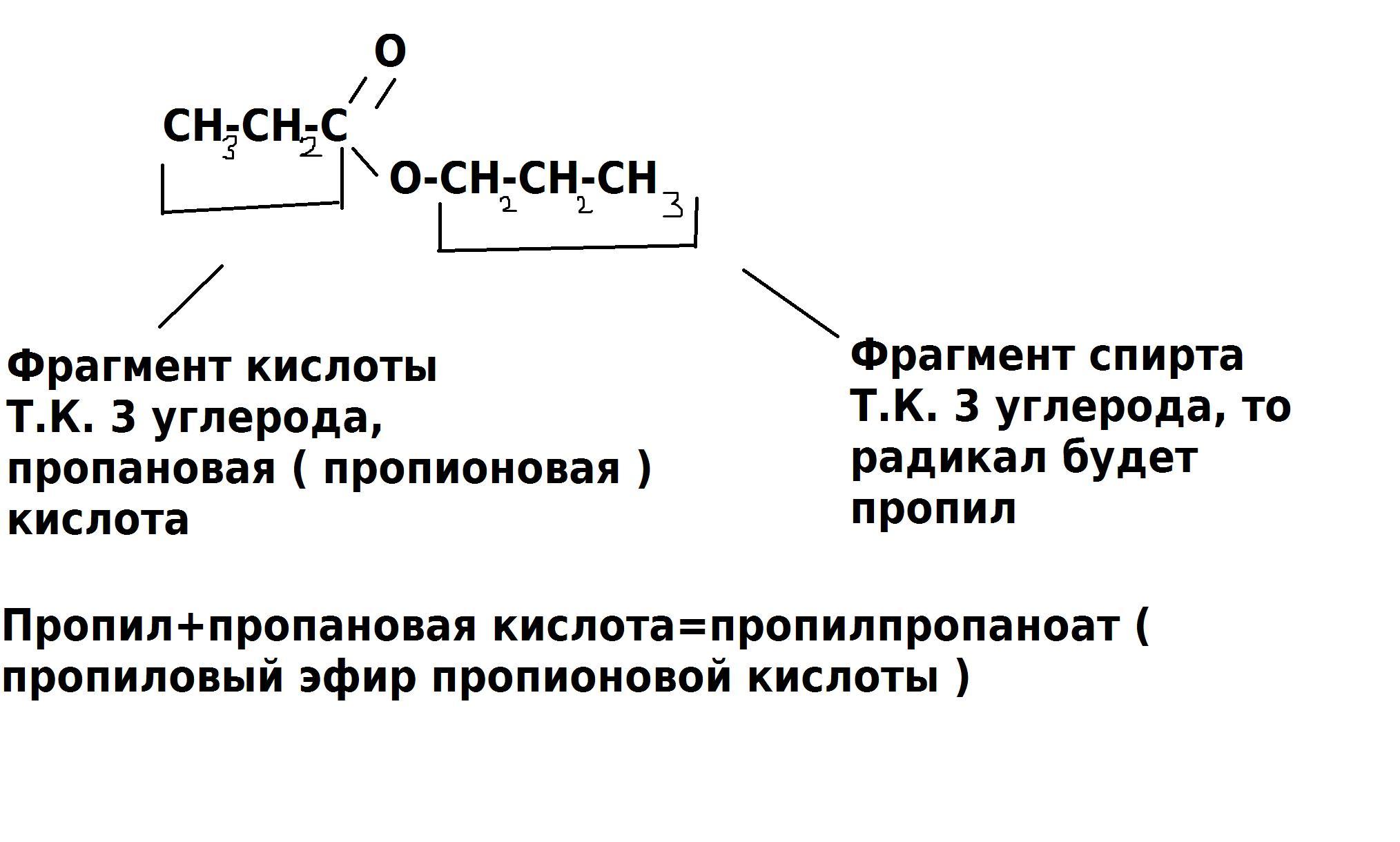 3)Для получение пропилпропаноата требуется провести реакцию этерификации. Чтобы узнать, какую карбоновую кислоту и какой спирт взять, нужно разбить формулу на две части: пропил---пропаноат.