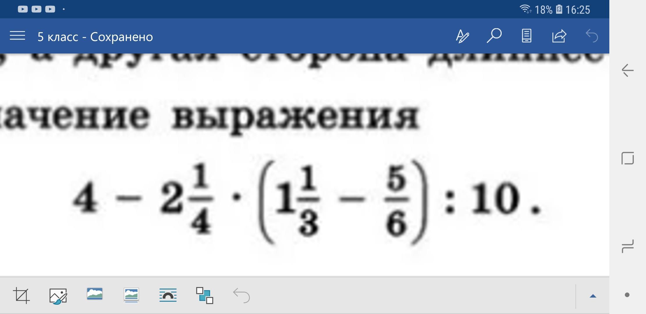 4 - 2 1/4 • 1/2 • 1/10 =