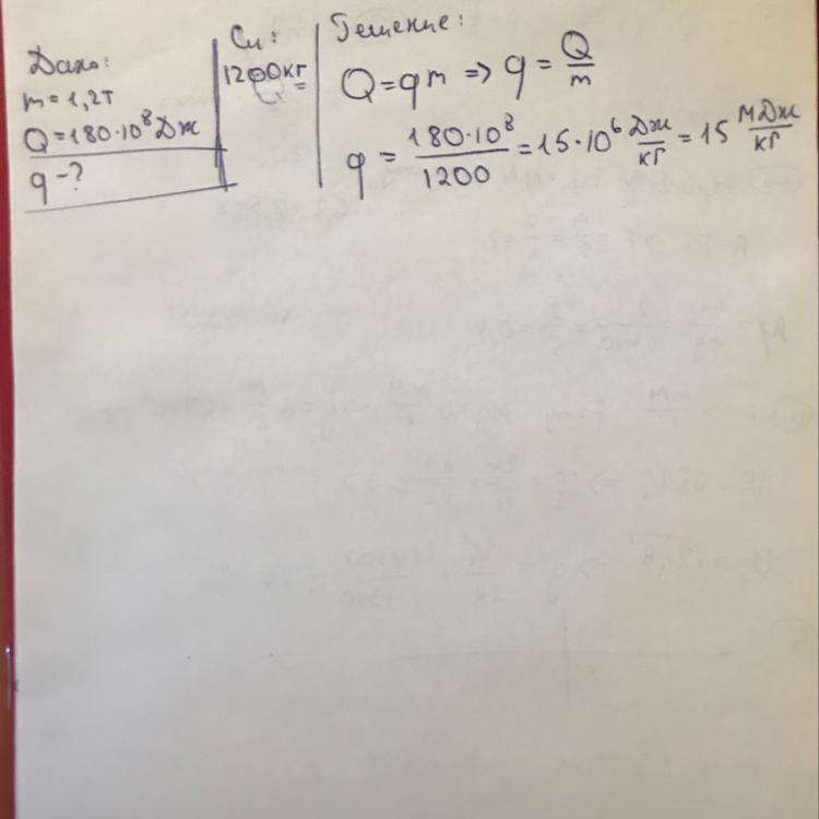 При полном сгорании торфа массой 1,2 т выделяется количество теплоты 180⋅10^8 Дж. Определи удельную теплоту сгорания торфа.