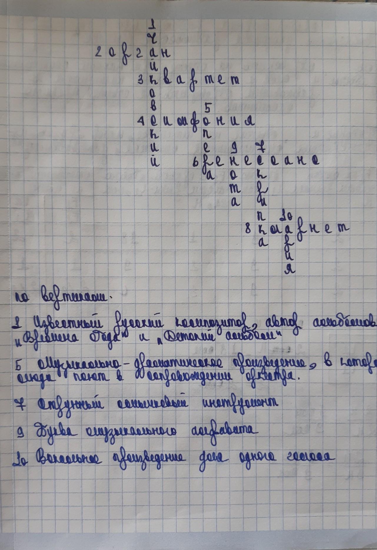 Составьте в тетради музыкальный кроссворд. Вопросы должны быть музыкальные, например: Самый большой музыкальный инструмент?(орган) и т. д.