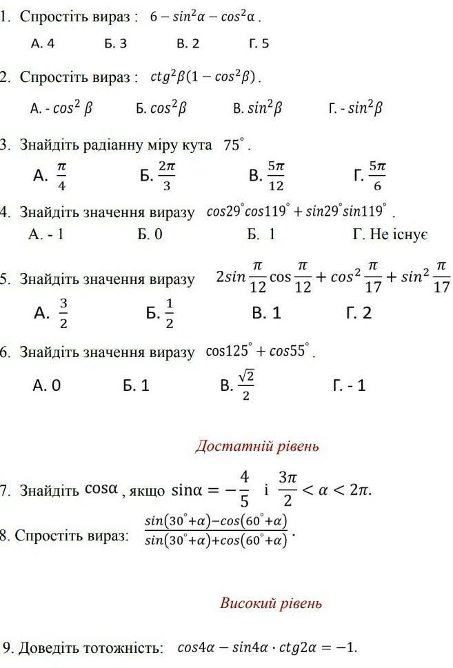 1) Г 6-1=5 ( основна тригонометрична тотожність)