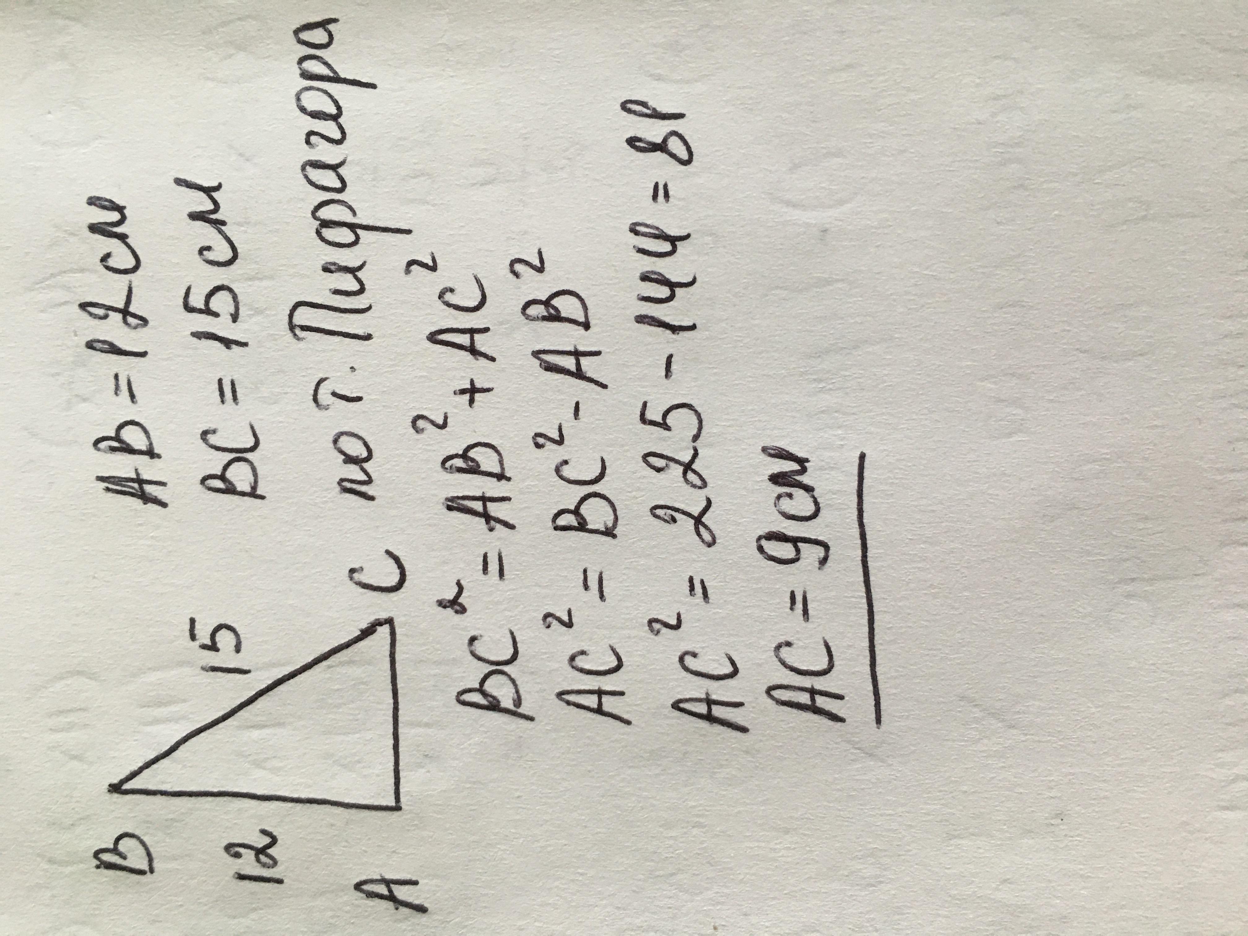 дан треугольник abc который катет ab равен 12 а гипотенуза bc 15 см посчитай ac по теореме пифагора