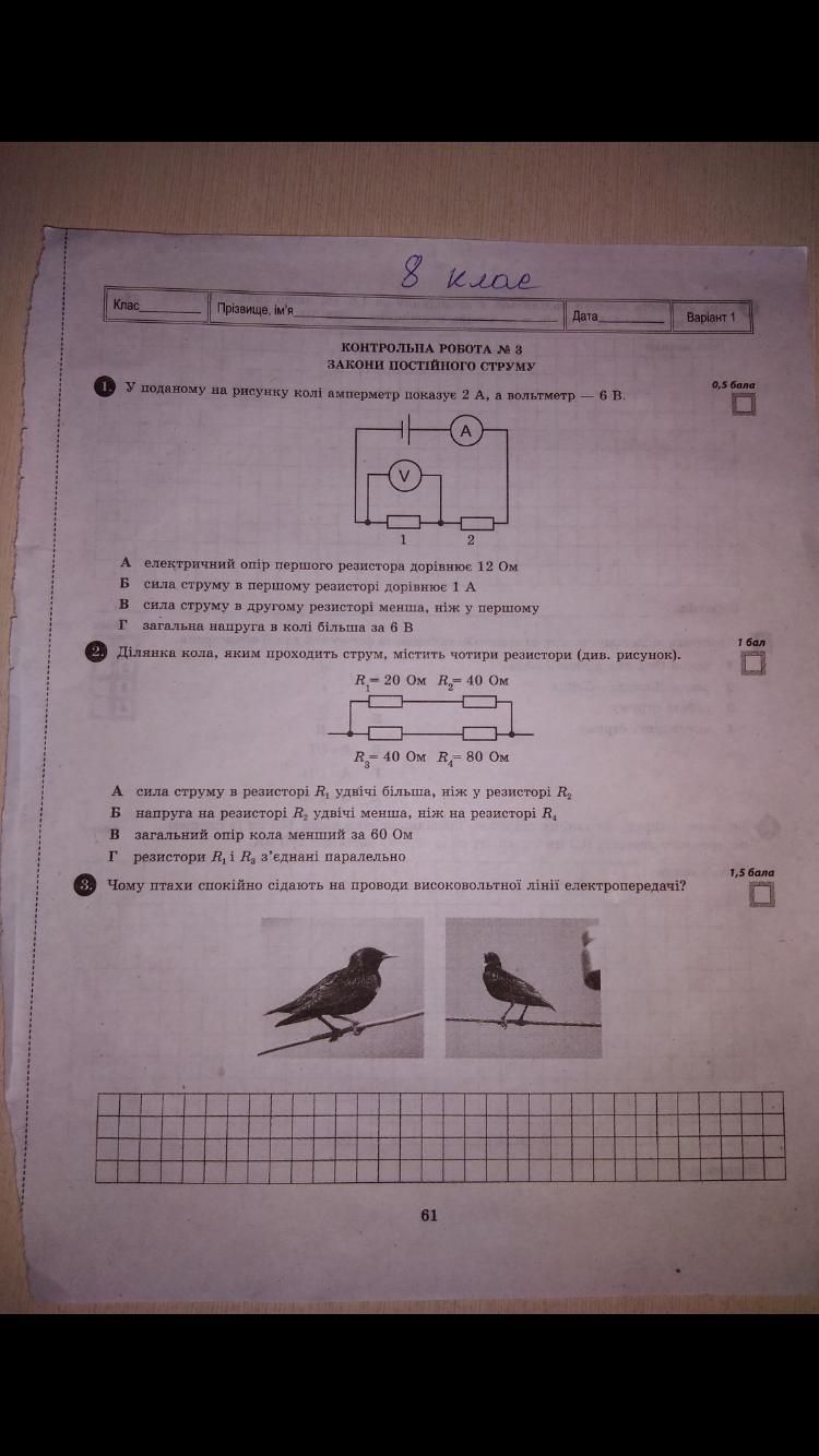Ответ: 1-г 2-а 3- Тому що птах, який сидить на проводі ЛЕП не замикає електричне коло й відовідно через нього не проходить електричний струм