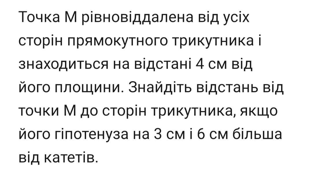 Точка М равноудалена от всех сторон прямоугольного треугольника и находится на расстоянии 4 см от его плоскости. Найдите расстояние от точки М до сторон треугольника, если его гипотенуза на 3 см и 6 см больше от катетов.