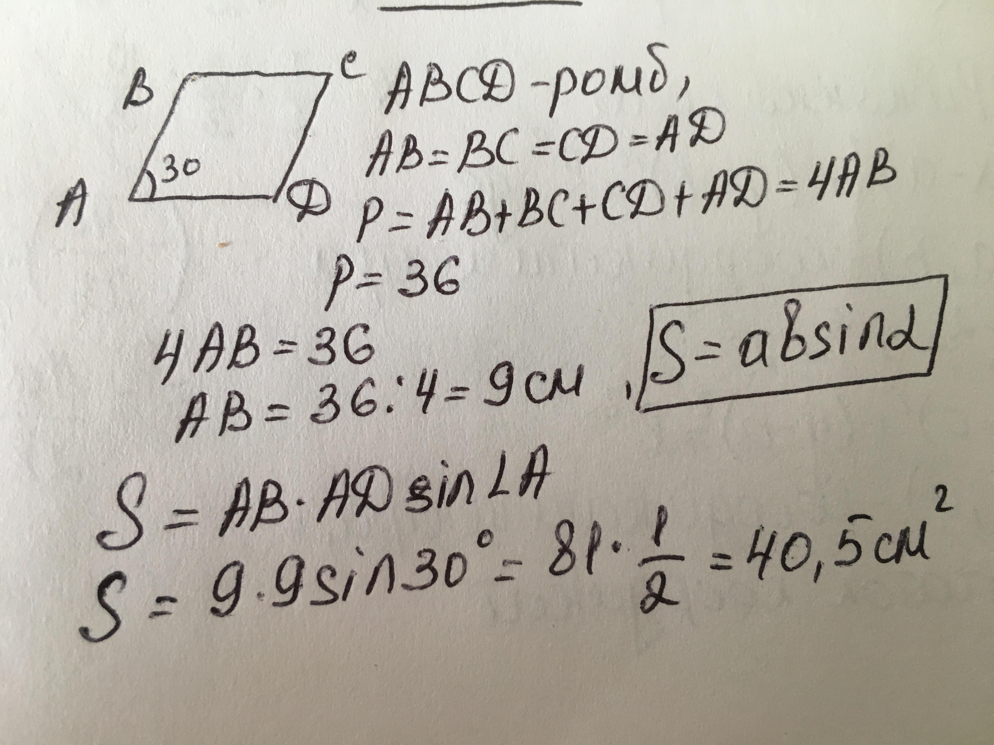 Дано: ABCD - ромб; P = 36; ∠B = 30°. Найти: S.