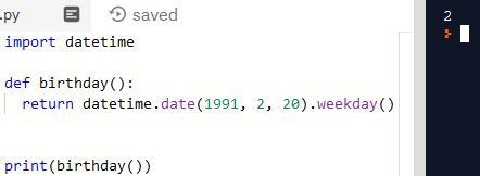 Днём рождения языка программирования Питон считается 20 февраля 1991 года. Напишите функцию birthday(), которая возвращает день недели данного дня. Дни недели нумеруются от 0 до 6, где нулю соответствует понедельник, а 6 - воскресенье.