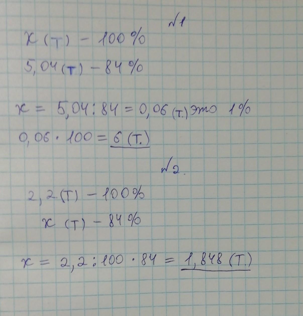 Ответ: из 6 тон пшеницы получили 5,04 т муки. Из 2,2 т пшеницы получили 1,848 т муки.