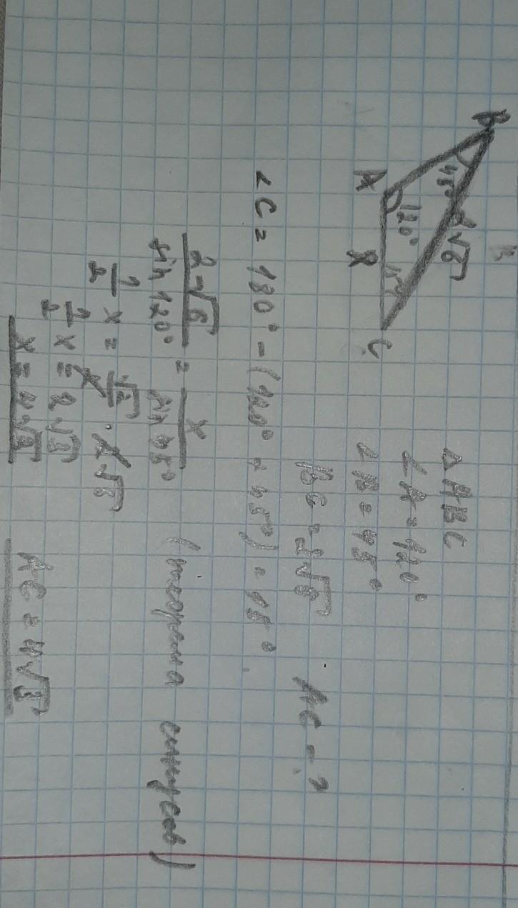 BC=2√6; sin120°=√3/2; sin45°=1/√2.Подставляем значение в формулу: