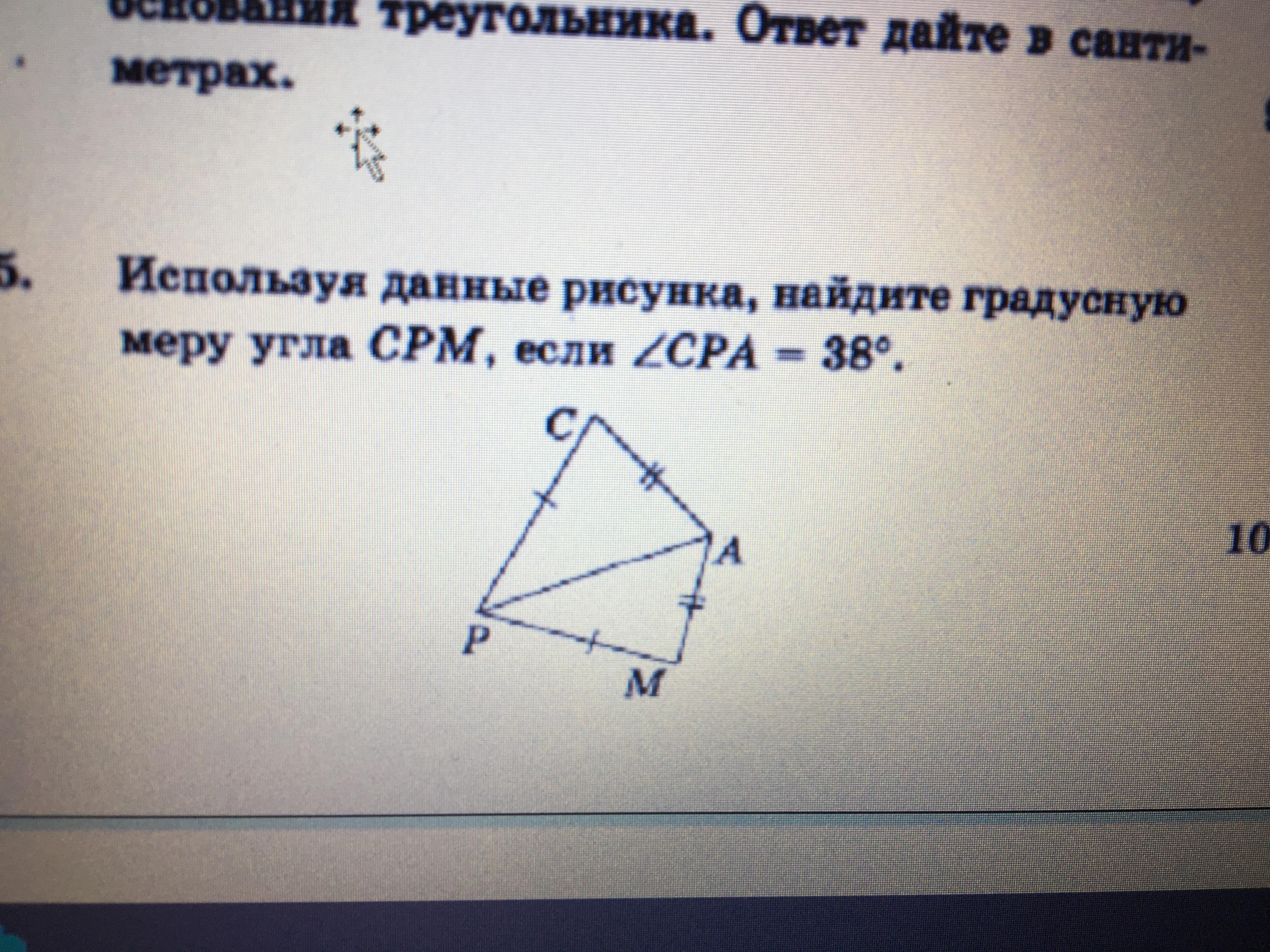 PA - общая сторона ⇒ ΔCPA = ΔAPM ⇒∠APM = ∠ APC ⇒ ∠CPM = ∠APM + ∠ APC = 38° + 38° = 76°