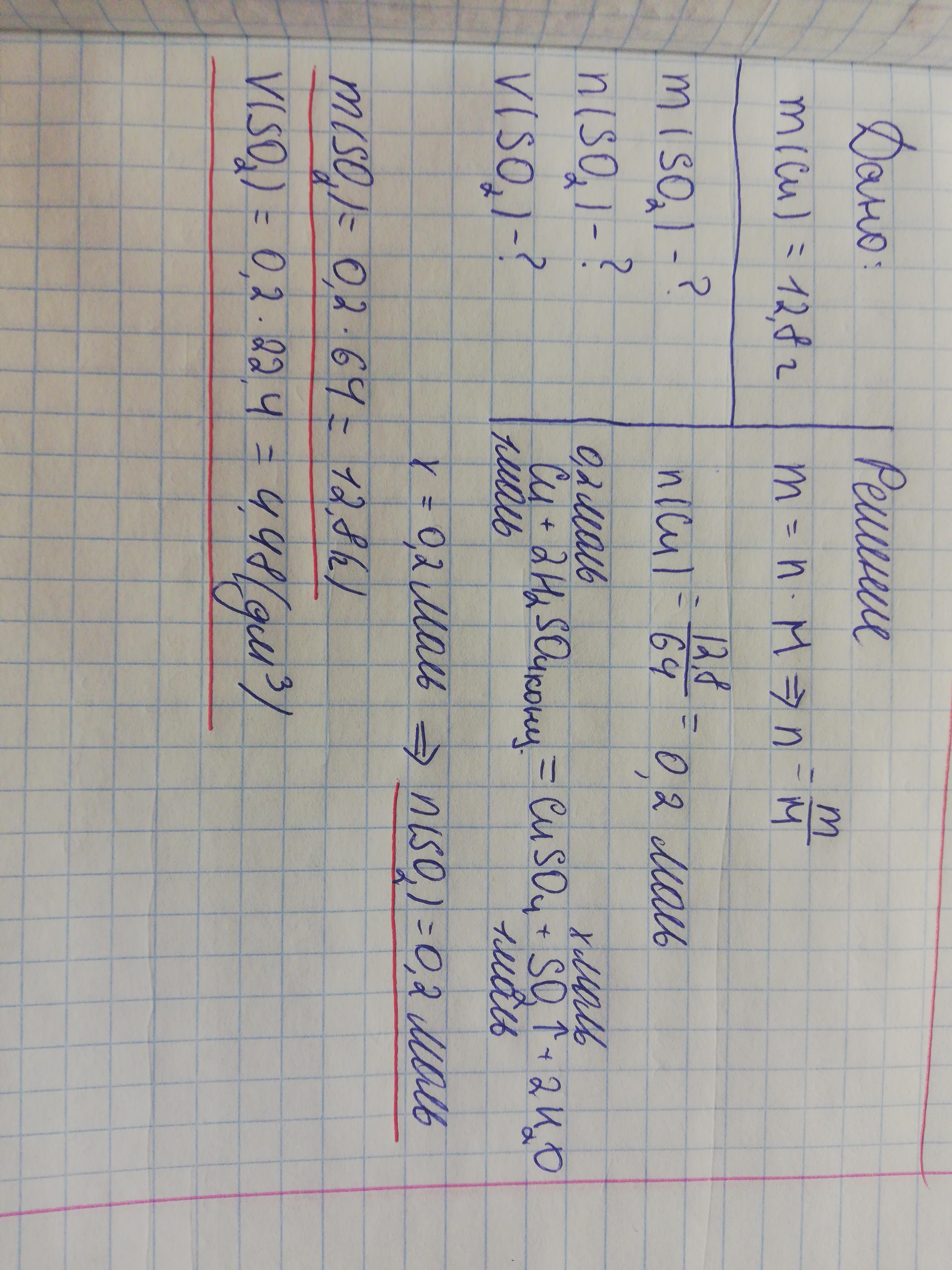 На 12.8г міді подіяли надлишком концентрованої сульфатної кислоти. Обчисліть масу. об’єм та кількість виділеного газу за (н.у.)