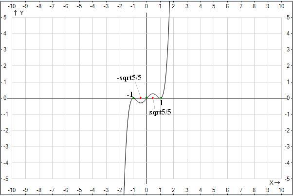 -sqrt5/5 < x < +sqrt5/5, y'>0, функция возрастает