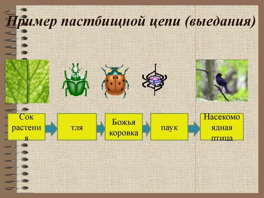 Пастбищная цепь или цепь выедания начинается с автотрофных организмов (растений) далее идет к растительноядным животным и хищникам (т.е. к консументам разных порядков) Заканчивается такая цепь редуцентами, разлагающими органическое вещество.