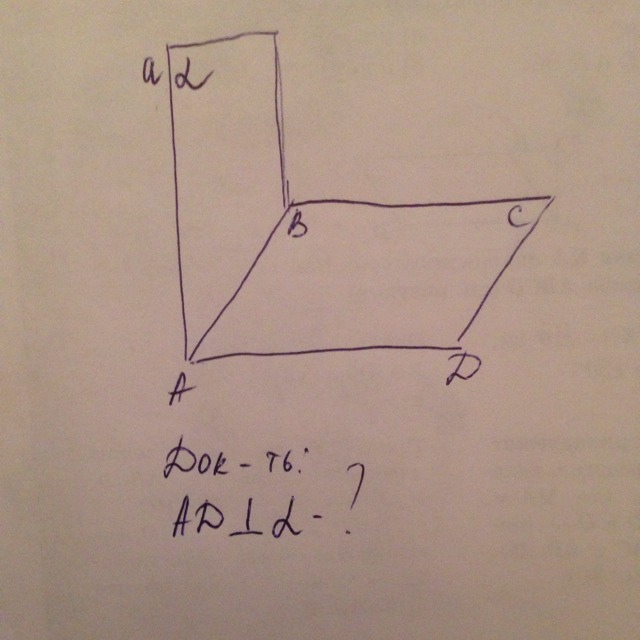 Нарисуй не параллелограмм, а прямоугольник, получится, что АВ перпендикуляр AD, а альфа лежит на отрезке АВ следует альфа перпендикуляр AD