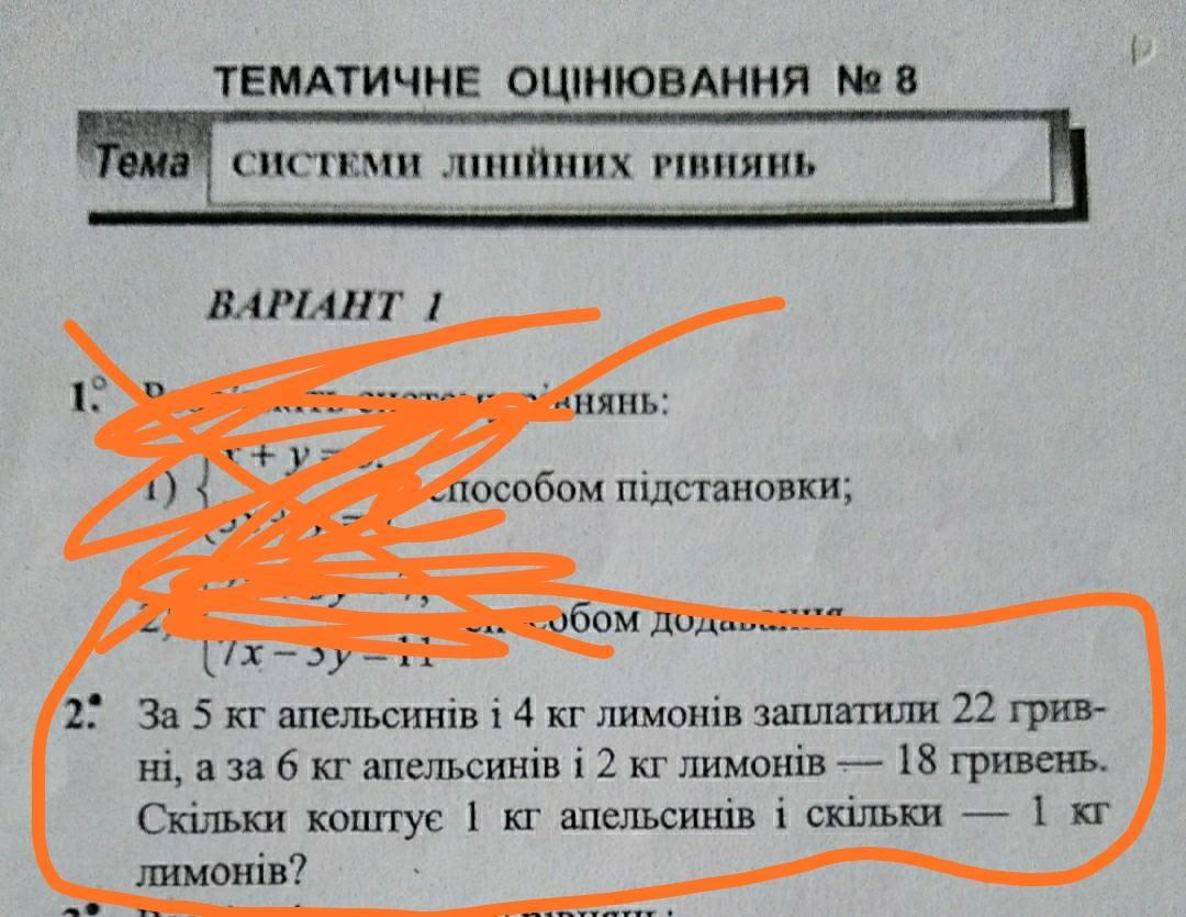 1 кг апельсин стоит х грн, а кг лимонов у, решим систему