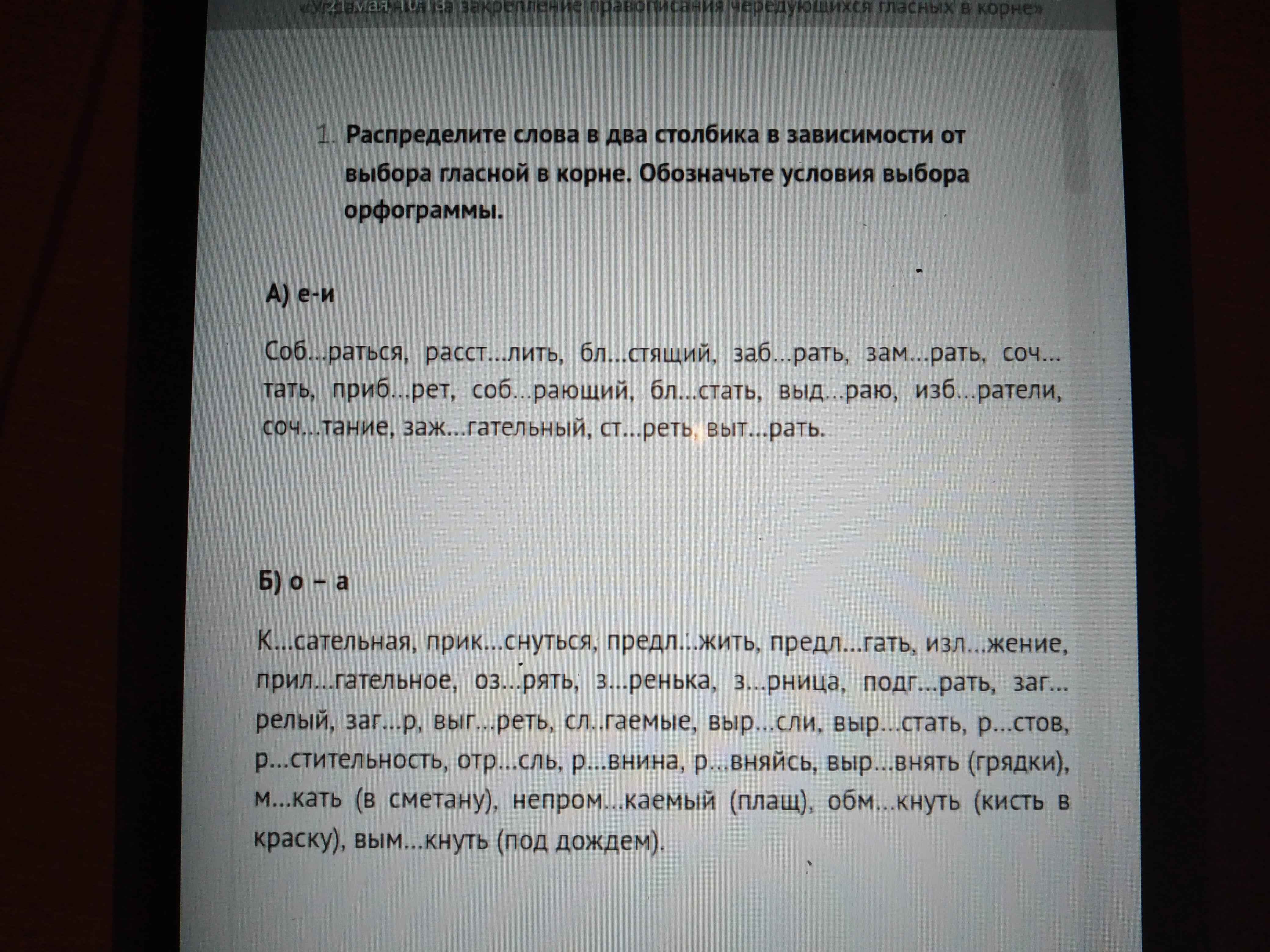 а) Собираться, расстелить,блестящий, забирать, замирать, сочитать, приберёт,собирающий, блестать,выдираю,избиратели, сочитание, зажигательный, стереть, вытирать.