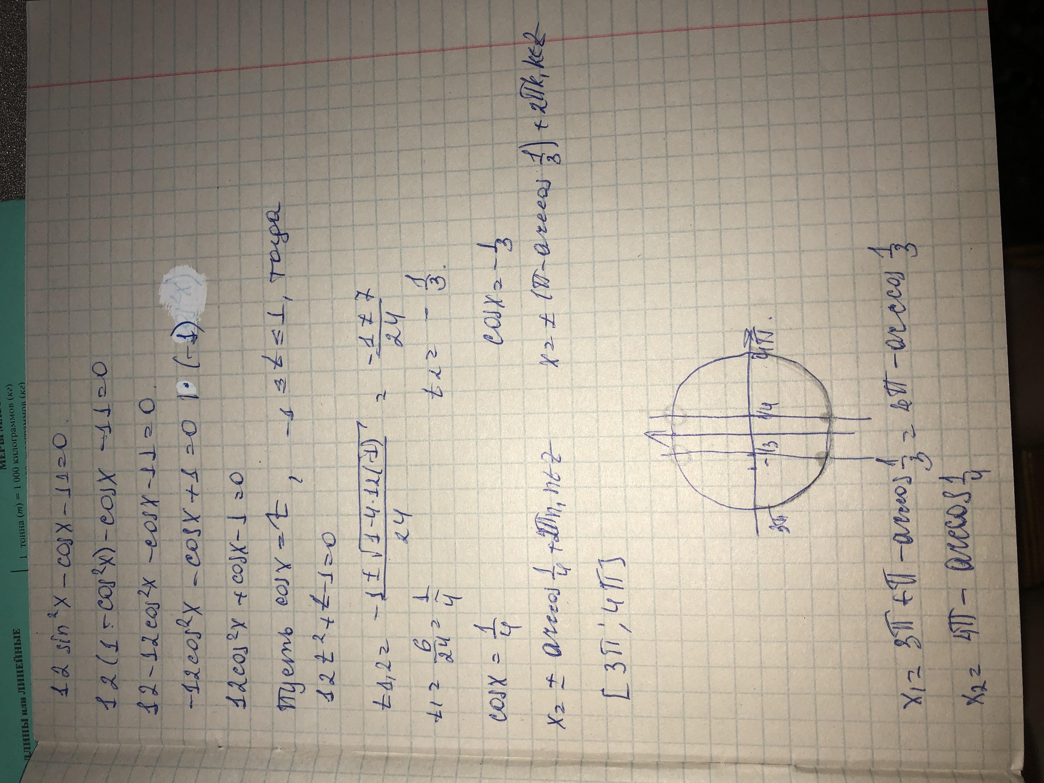 x1=4П-arccos1/4 , x2=4П-(П-arccos1/3)=3П+arccos1/3 .