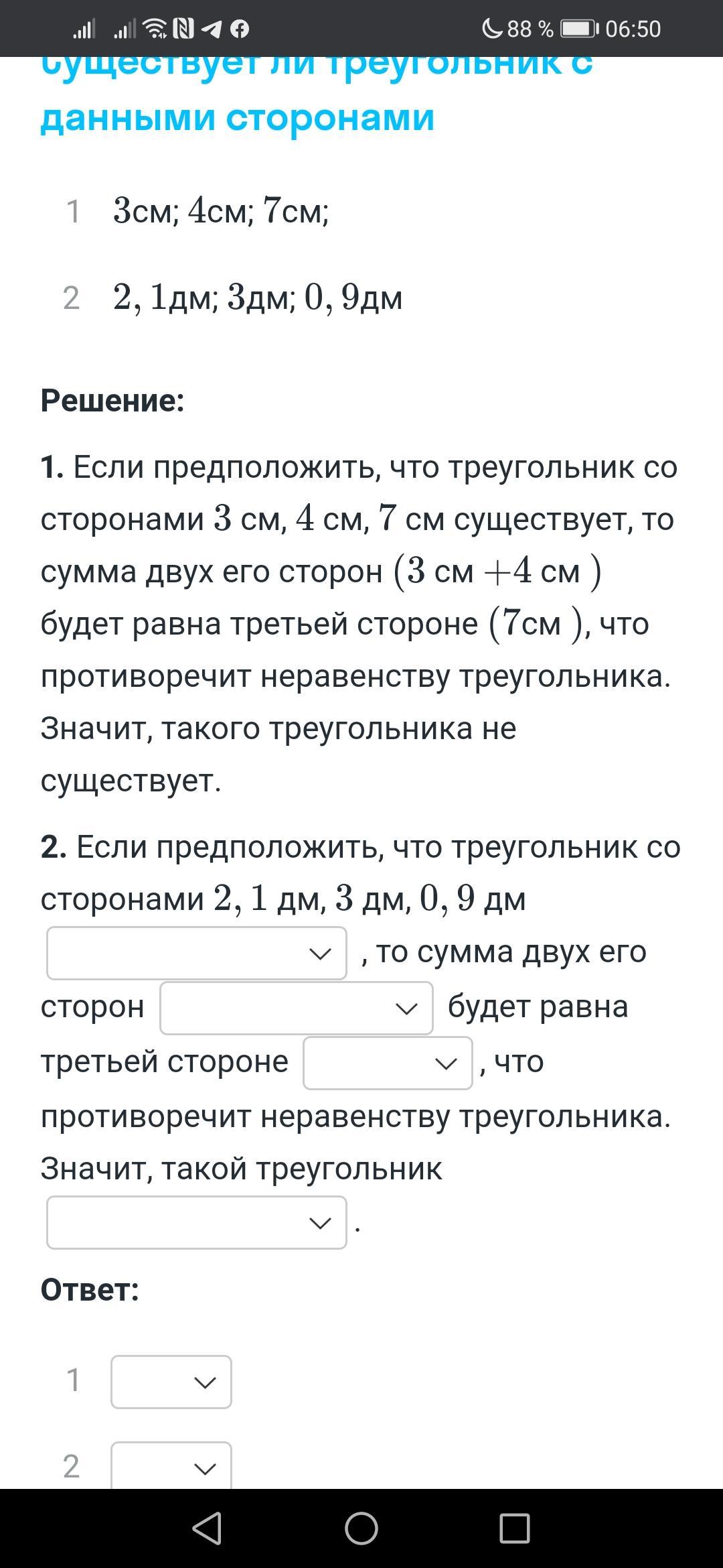 1. Если предположить что треугольник со сторонами 2,1 дм; 3 дм; 0,9 дм существует, то сумма двух его сторон (2,1 дм + 0,9 дм) будет равна третьей стороне (3 дм) , что противоречит... треугольника.