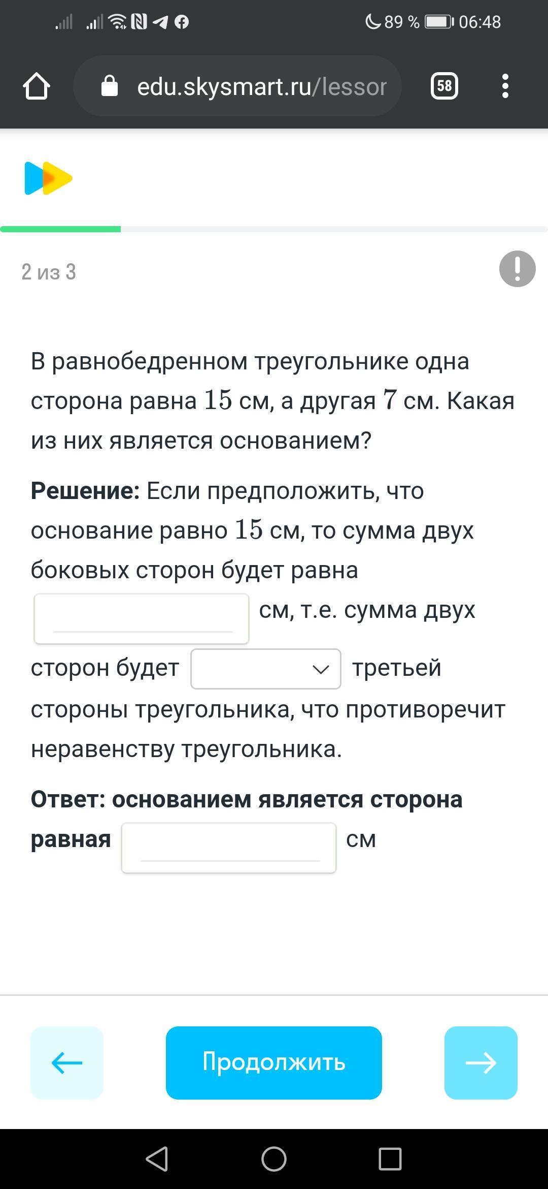 2. Если предположить что основание равно 15, то сумма двух других боковых сторон будет равна (7 см + 7 см), т.е сумма двух других сторон будет меньше третьей стороны треугольника, что противоречит...треугольника.