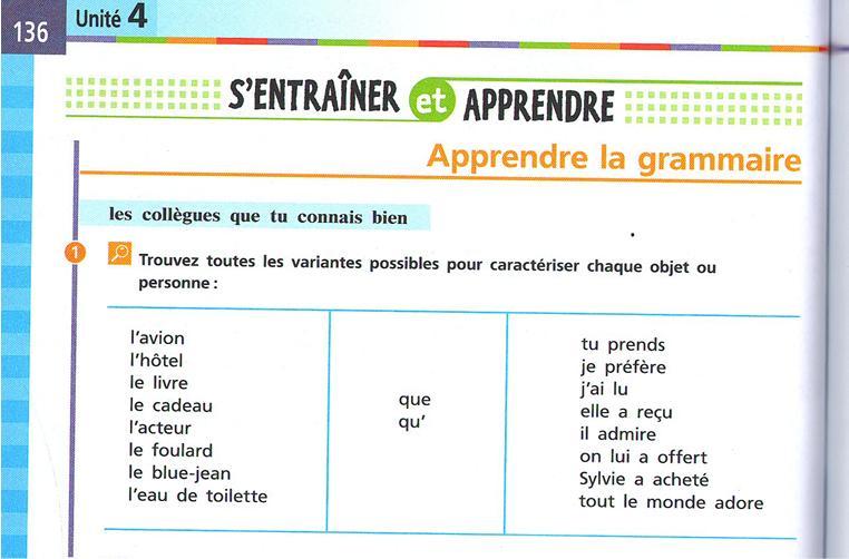 Соедините слова из левой колонки со словами из правой колонки при помощи que или qui. например: l’avionquetuprends