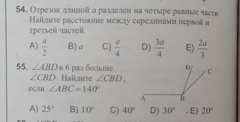 55. Весь угол -140 градусов, ABD в 6 раз больше CBD, а значит, весь угол состоит из 7 частей и угол CBD=*140=20 градусов, т.е. ответ - Е)20